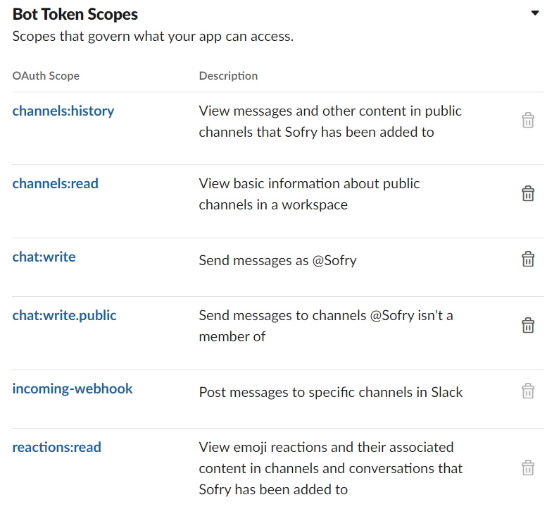 - oAuth & Permissions 메뉴 선택하고 Bot의 기능 선택