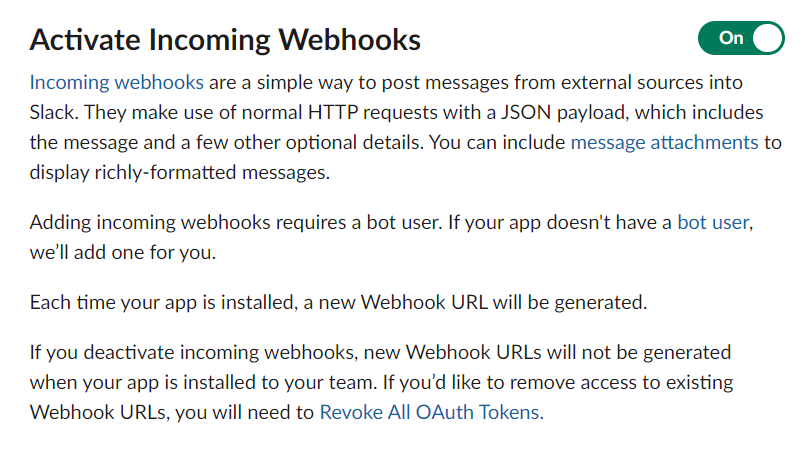 - Features - Incoming Webhooks에서 Active Incoming Webhooks를 on으로 설정하고 Add New Webhook to Workspace