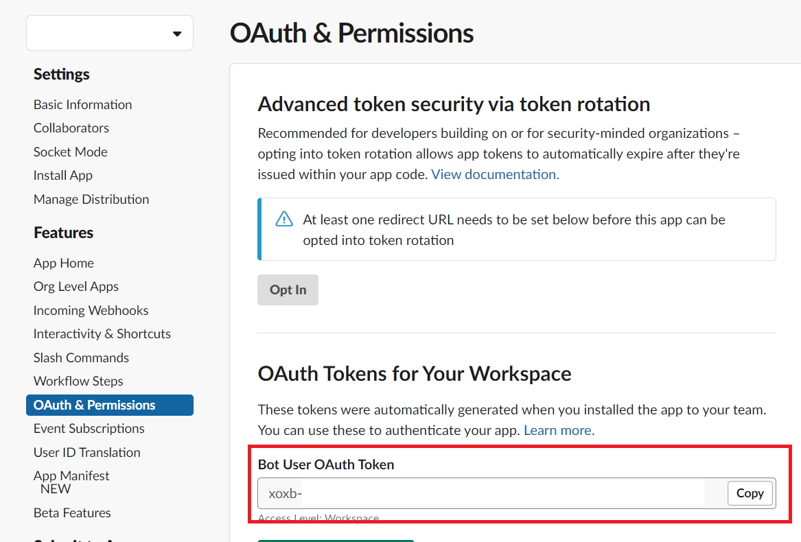 토큰 아이디는 OAuth & Permissions 에 표시됨