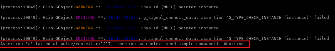 Assertion 'c' failed at pulse/context.c:1217, function pa_context_send_simple_command(). Aborting.